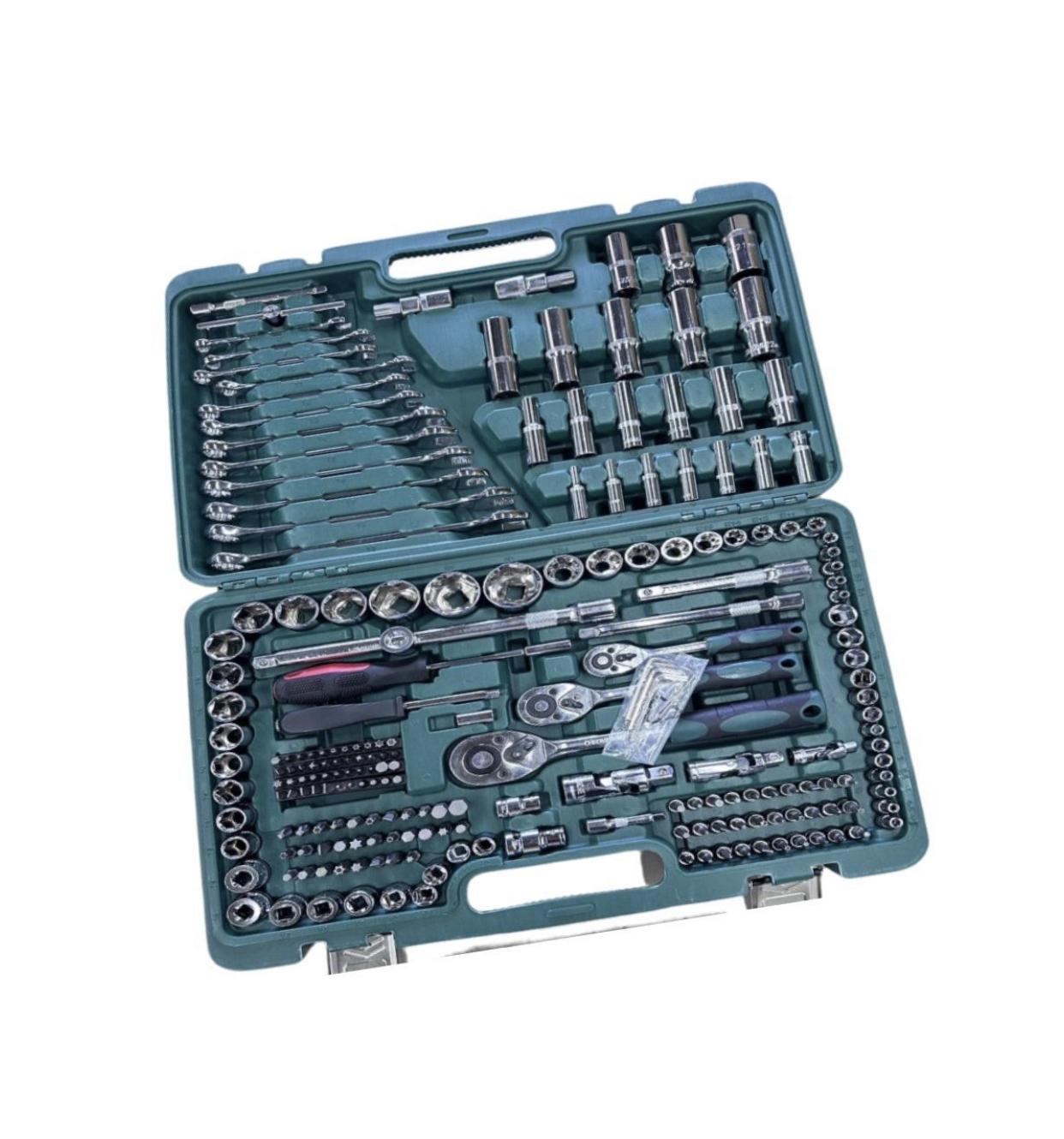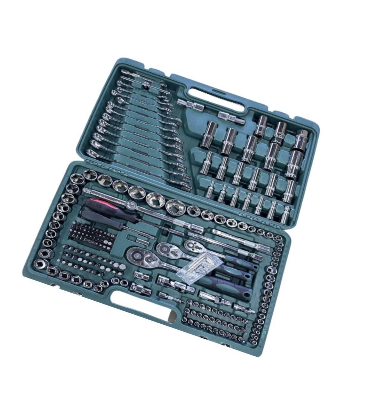 This 218-piece mechanic tool set offers a comprehensive collection of essential tools for tackling a wide array of tasks. Chrome‑vanadium steel construction ensures durability and corrosion resistance, while the full-polish chrome finish provides easy cleaning. The set includes 1/4", 3/8", and 1/2" drive ratchets featuring 72‑tooth mechanisms for minimal arc swing and fast socket release. Additional items include extension bars, adapters, hex keys, screwdrivers, pliers, a hammer, and various bits and fasteners—perfectly organized in a robust metal toolbox with ball-bearing drawer slides. Ideal for hobby mechanics, home maintenance, or as a starter professional kit backed by a full lifetime warranty on the tools and 1‑year warranty on the toolbox.