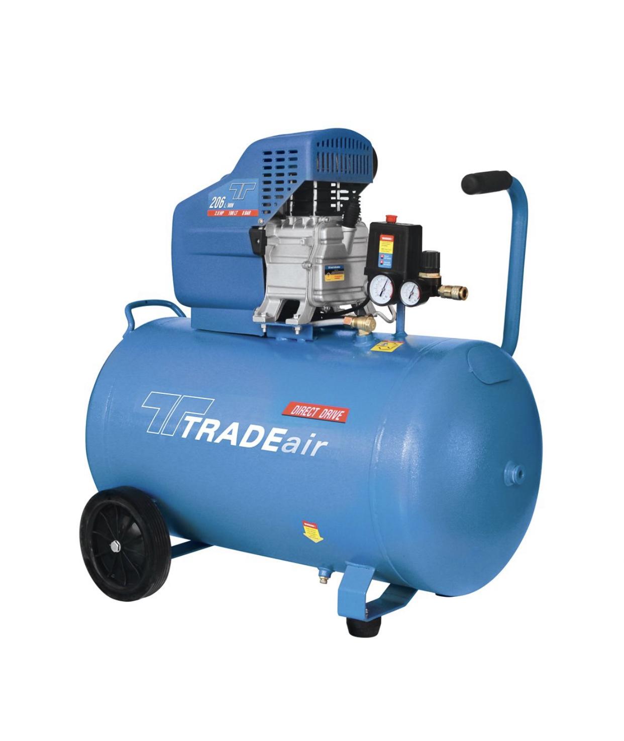 The TradeAir 100 L lubricated compressor is built tough for workshop and DIY use. Featuring a robust cast‑iron, direct-drive pump and a reliable 2.0 HP motor, it delivers stable, continuous high-pressure air at up to 8 Bar. Designed with wheels and a handle, it's easy to move around, while its oil-lubricated mechanism extends service life and reduces wear—perfect for powering nail guns, spray paint, and pneumatic tools.